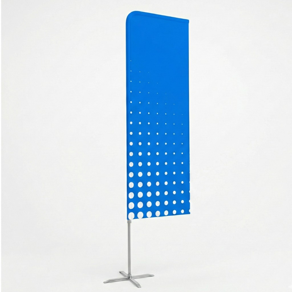 Prints are created from our ready-made templates or based on a design you submit. We also offer various base types, including those that can be driven into the ground, screwed into the ground, or with a rotator. A flag fluttering in the wind is a great advertising medium because it creates a unique and eye-catching look. These flags can be placed indoors, but they’re also suitable for beaches or ski slopes.