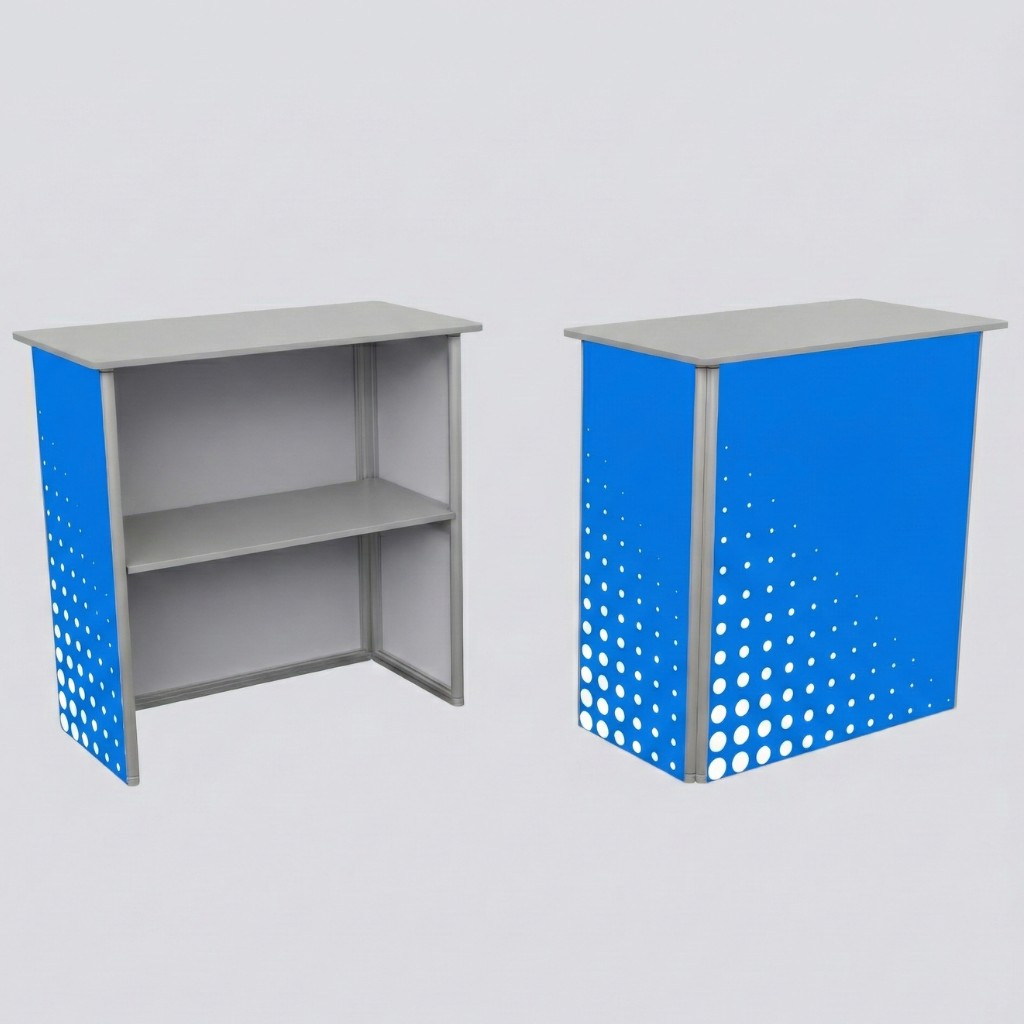 The folding counter is an advertising medium and a comfortable workstation in one. It’s perfect for trade shows and conferences. Its lightweight, aesthetically pleasing, and foldable construction is made of aluminum profiles. The counter comes with polyester prints for your personalized graphics. The counter also includes a shelf, perfect for storing documents and catalogs.