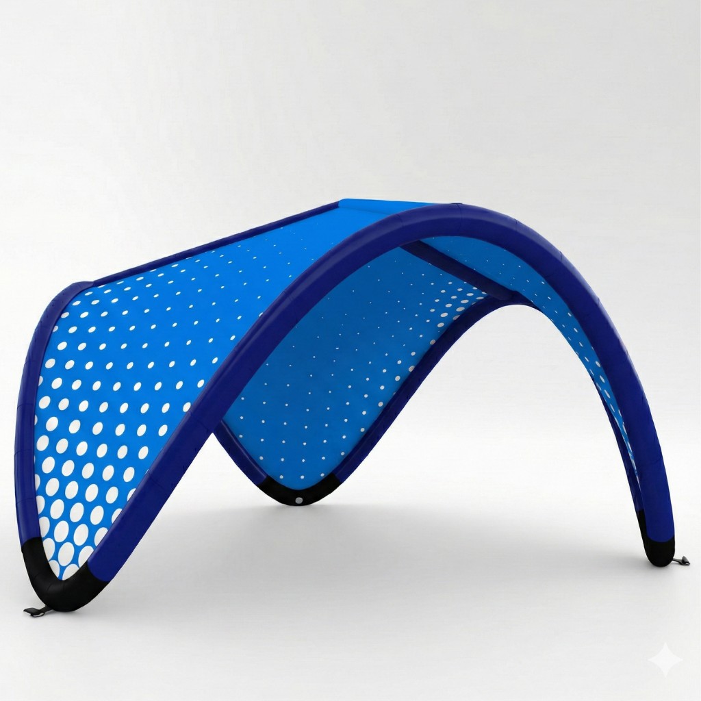 If you’re planning a promotional event and want visitors to notice your booth from afar, the Wave inflatable tent is sure to meet the challenge. The tent’s structure is open on three sides and serves not only to protect the item underneath but also to showcase it. The modern design of the Wave promotional tent can be complemented with prints featuring your company graphics, allowing the Wave tent to help promote your brand.